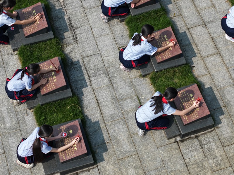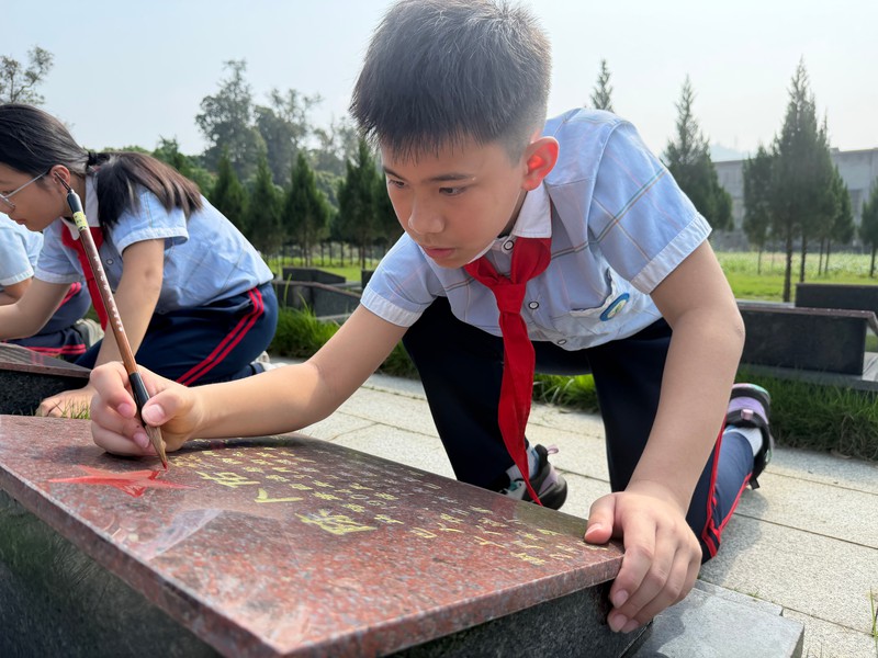 缅怀仪式结束后,师生们开展为烈士墓碑描红、参观革命陈列馆活动。沿着缓坡向上,烈士墓碑呈方形排列,那一颗颗鲜艳的五角星,如同列队的卫兵守望着这方曾经战斗过的热土。学生们俯下身子,拿出准备好的画笔和颜料,一笔一画地为碑身上的五角星描红。其余师生则通过馆内的历史图片、文献资料,重温右江革命根据地的烽火岁月,感悟革命先辈不畏艰险、不怕牺牲的革命精神,接受沉浸式红色洗礼。“看着墓碑上鲜艳的五角星,我深深感受到今天的幸福生活来之不易,是无数革命先烈用生命换来的。”参与描红的学生感慨道,一定要以英烈们为榜样,努力学习,长大后为家乡、为祖国贡献力量。