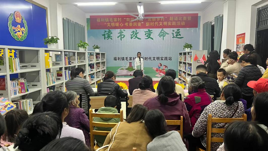 同样的书香氛围也弥漫在福利镇毛家村。近日,该村在农家书屋成功举办了“田园诗画·美丽乡村”朗诵比赛,孩子们踊跃登台,在诵读中感受中华诗词的独特魅力。王语萱同学在活动中朗诵了《繁星》,她表示会经常和小伙伴来书屋看书,是书籍让她们开阔了视野。