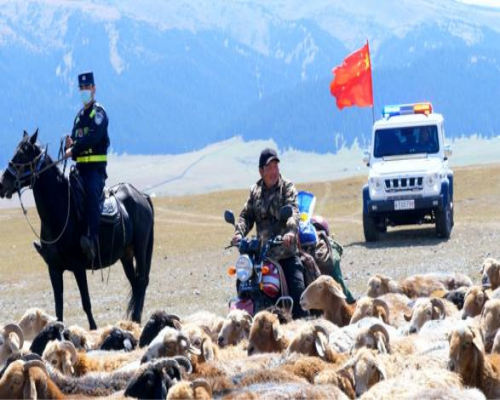 8月28日,新疆出入境边防检查总站博州边境管理支队博乐边境管理大队海西边境派出所移民管理警察们组成“护牧小分队”,帮助辖区新疆博尔塔拉蒙古自治州博乐市阿热勒托海牧场牧民将20万余头牲畜从赛里木湖夏牧场迁徙至秋牧场。