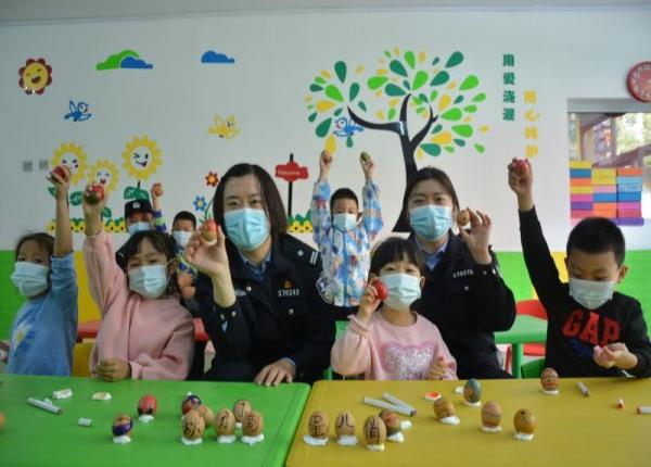 民警们引导孩子们进行绘彩蛋,并启发他们在鸡蛋上绘制丰富的内容。有的画人物,有的画动物,有的画植物,画好后孩子们举着自己的作品和其他小朋友交流,解释着自己鸡蛋上图画的丰富内涵。