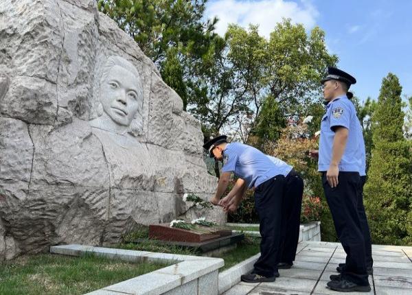 在浙江籍红色女特工朱枫烈士的雕像前,民警们认真聆听了她的传奇事迹,并献上了鲜花。