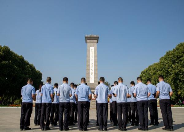 在烈士纪念碑前,民警面对鲜红的党旗重温入党誓词。“在这个意义重大的日子,我们重温入党时的决心和信念,这激励了我们要始终铭记初心使命,在以后的工作生活中不断开拓进取、奋发向上。”执勤一队副队长袁仙说。