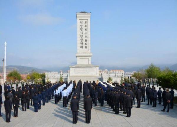 9月30日上午,向上边境派出所民警与驻地党政机关工作人员及各界群众一同来到图们市革命烈士陵园,隆重举行公祭活动。全体人员在革命烈士纪念碑前,奏唱国歌、重温入党誓词,并向烈士纪念碑敬献花篮,肃立穆默哀,深切缅怀革命英烈。随后,民警还与各界群众一起,共同瞻仰了革命斗争年代,牺牲在图们地区的英烈名录。
