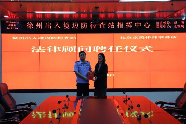 近日,江苏徐州出入境边防检查站举行法律顾问聘任仪式,聘请北京京腾律师事务所律师孙菁担任法律顾问。