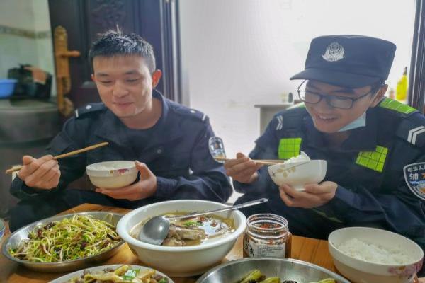 “真的太好吃了!”“吃到谢大厨做的饭菜是我人生的第四大幸事。”“不愧是谢大厨,这手艺,比得上米其林大厨了。”……执勤民警喜笑颜开地纷纷对菜品加以点评。