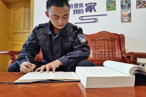 蹇小源自成为边境管控专职辅警以来,一直在该站执勤岗位上。他深知自己肩上的责任重大,边境检查站的工作就是细一点再细一点,他积极主动学习理论知识,利用休息时间虚心向老同志请教查缉经验、查缉方法。有一次,半夜一点过了同一宿舍的民警张涛看到蹇小源的被窝里透着光以为他还在玩手机,便走过去提醒他早点睡觉,轻轻拉开被子才发现他打着手电筒在看一本笔记本,他说:“我想快点适应这个工作,我找陈菲班长借来了他新兵时用的笔记本,里面好多知识呢,我再看一会就睡,我保证不会影响白天的工作。”现在他已经是他们执勤中队里的“前辈”,是其他专职辅警的榜样!