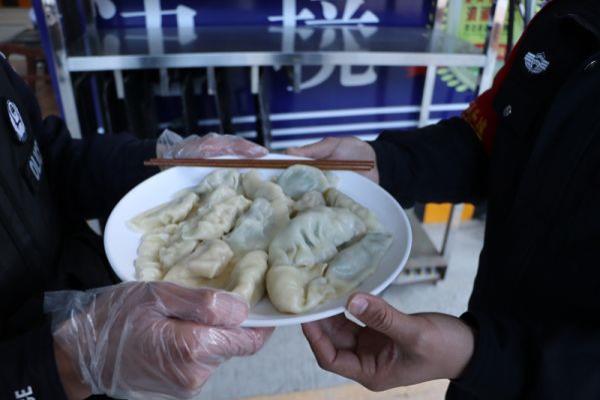 在吃饱之后,后勤保障人员迅速行动,将一份份暖心饺子分装后送到正在执勤的民辅警手中,为他们在寒冷的冬天送去暖心饺,让大家在严寒的冬日感受到“家”的温暖。