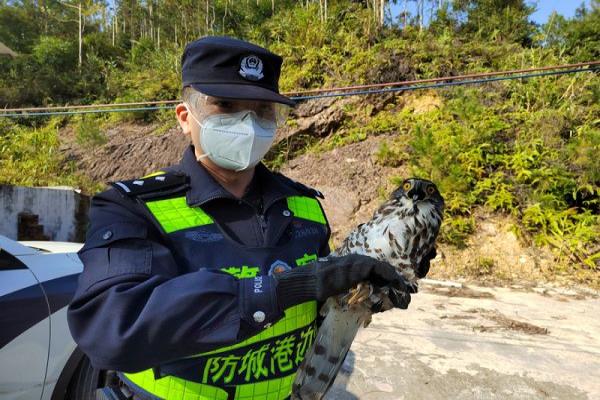 “有只老鹰被我抓住了,你们赶紧来看一下。”1月2日,防城港边境管理支队江山边境派出所的民警接到了江山镇新六村的江先生报警,他称在自家发现一只偷吃鸡的老鹰,不知是否是保护动物。