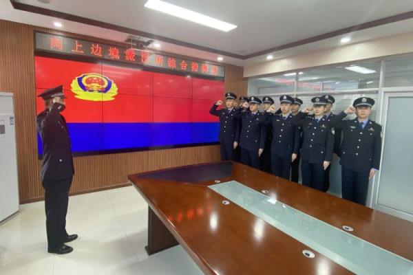 “我是中国人民警察,我宣誓:坚决拥护中国共产党的绝对领导,对党忠诚、服务人民、执法公正……”在派出所会议室,民警们整齐列队,面向警旗高举右拳庄严宣誓,真切表达出移民管理警察的忠于党、忠于法律、忠于人民的忠诚本色。期间,派出所党支部还组织民警开展了手抄训词、红色观影等活动,激发全体民警以更加饱满的热情、昂扬的斗志,更好地履行维护辖区安全稳定的职责使命。