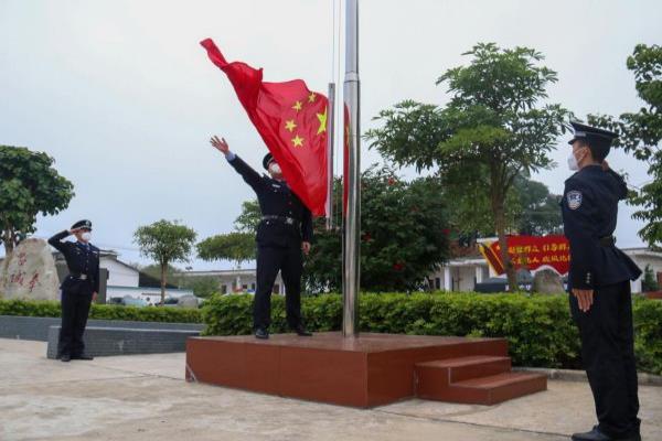 上午9时,1名升旗手、2名护旗手英姿挺拔、精神抖擞、步伐铿锵,正步走向升旗台,升旗仪式正式开始。在雄壮激昂的国歌声中,鲜艳的五星红旗冉冉升起,迎风飘扬。全体民辅警列队肃立,警容严整,面向国旗致以崇高敬礼,深切表达对祖国的无限忠诚和热爱。