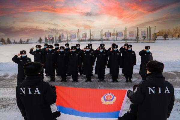 同升国旗,共担使命。全体民警整齐列队,顶着-38℃严寒,沐浴着第一缕朝阳,升国旗仪式正式开始。3名升旗手,护旗队迈着铿锵有力的步伐,护卫着国旗正步走向升旗台。参加仪式的全体民警身着警服,整齐列队,面向国旗注目敬礼,伴随着雄壮的《义勇军进行曲》,鲜艳的五星红旗冉冉升起,迎风飘扬,彰显着全体民警对伟大祖国的无限忠诚和热爱。