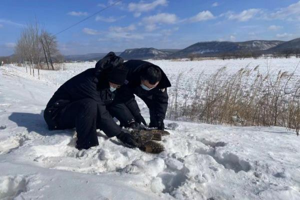 近日,延边边境管理支队春化边境派出所民警在走访过程中,在吉林省珲春市春化镇草坪村道口附近的331 国道上,发现一只鸟鹰躺在雪地里不动。