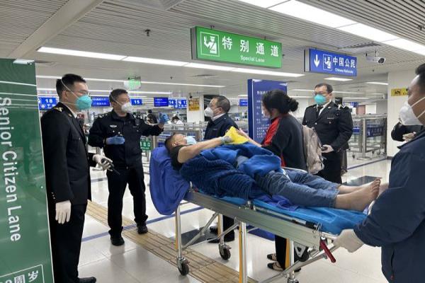 2月8日15时许,执勤三队民警杨毅铭在罗湖口岸一楼入境大厅巡查时,发现一位拄着拐杖的老人不慎摔倒在通道前,小杨一边用对讲机向队领导报告,一边快速跑上前查看老人的状况。经了解,该老人已年过八旬,这几年一直没有机会返回内地探望亲人。近日老人得知罗湖口岸恢复通关后,便迫不及待收拾好行李,独自一人跨过罗湖桥。因老人年事已高、身体状况也不是很好,走到口岸入境大厅时,不禁双脚发软摔倒在地上。值班队领导孔莹莹了解情况后,与民警们细心地询问和检查了老人的身体情况,发现老人并无大碍,又及时为老人推来了爱心轮椅,并将老人推送到“特别通道”前,为老人优先办理了入境手续,还将老人送至口岸门口,与义工做好交接。老人对民警们的爱心帮助非常感激,他用颤抖的嘴唇激动地说道“三年了,三年没有回来了,我腿脚不便,多谢你们的帮忙,我又能见到家人了。”