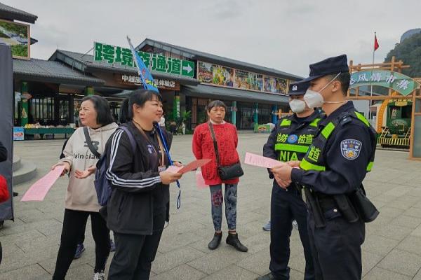 随着疫情防控“乙类乙管”政策的实施广西壮族自治区大新县德天跨国瀑布景区全国各地游客纷至沓来。为确保游客平安,边境安全,广西硕龙出入境边防检查站移民管理警察积极作为在景区开展“保游客平安,护边境安全”法律法规宣传活动。