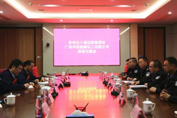 座谈会上,郁荣胜站长就边检机关职能任务、工作性质、单位的基本情况以及近年来该站在优化服务举措,助力码头开放等方面的工作进行了介绍。梁泉涌总经理对钦州出入境边防检查站一行人的来访表示热烈欢迎,向参加座谈人员介绍了华谊公司的企业发展信息、公司背景和重大项目建设情况,并对钦州出入境边防检查站靠前服务,确保该公司配套码头如期对外开放,为该公司产品及原材料安全顺畅通关表示衷心的感谢。