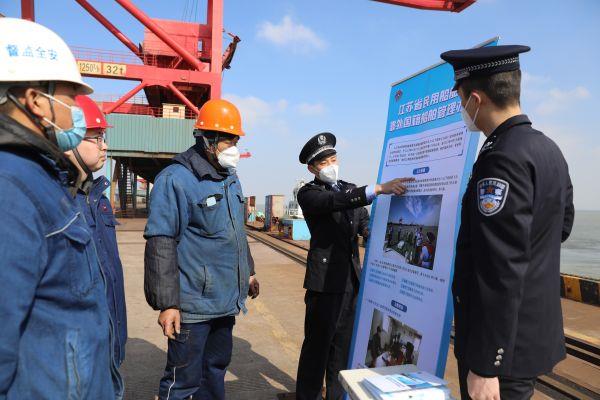 《江苏省民用船舶搭靠外国籍船舶管理办法》将于4月1日起施行。2月27日,江苏出入境边防检查总站张家港出入境边防检查站组织普法小队深入港口船企和码头一线,开展普法宣传活动。