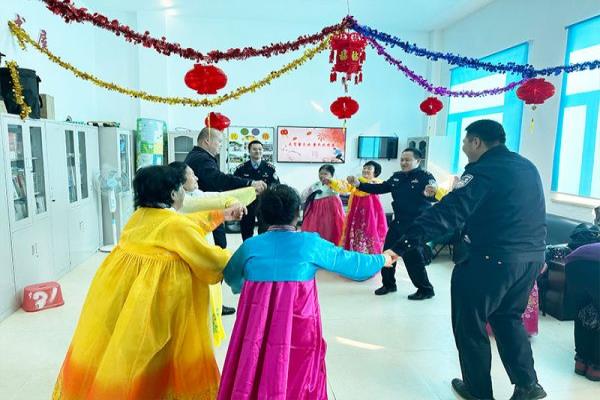 民族团结一家亲,同心共筑中国梦。朝鲜族人民勤劳、勇敢,创造出充满智慧的诸多生活风俗文化,每逢喜庆节日、盛会,朝鲜族群众都会穿着洁净朴素的传统服饰,伴随着优美的民族乐曲尽情舞动。为促进朝、汉两族民众之间的交流互动,南坪边境派出所每逢端午、中秋、元宵等传统节日,都会牵头组织各类喜闻乐见的庆祝活动,将朝、汉两族群众聚在一起载歌载舞,共庆佳节。在2023年元宵节,派出所民警来到了柳洞村村部,将一碗碗热腾腾的汤圆送到群众手上,并邀请辖区群众共同玩乐朝鲜族游戏、在优美的旋律下翩翩起舞、品尝朝鲜族美食,每个人的脸上都洋溢着幸福的笑容,大家共同祝愿伟大祖国愈加繁荣富强,祝福各族人民佳节快乐。数年如一日,南坪边境派出所在图们江畔与辖区群众彼此邻里守望、互帮互助,相亲相爱亲如一家。