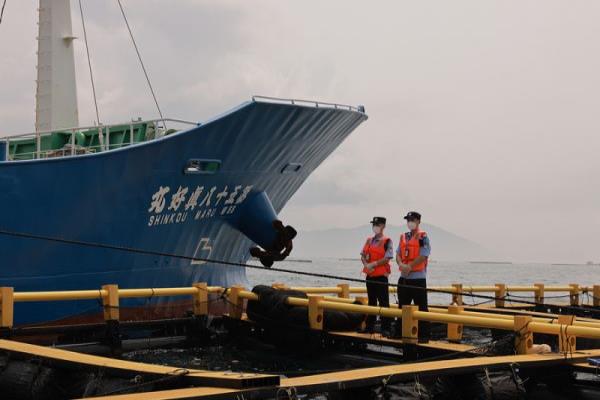 4月7日下午,一艘载有19万尾章雄鱼鱼苗的“第五十八真好丸”号日本籍渔船在完成出境边防检查手续后,缓缓驶离陵水新村港前往日本鹿儿岛,这也标志着2023年三亚口岸鱼苗出口业务正式拉开序幕。