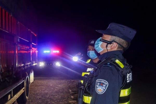 月光下,阵阵汽笛声响起,满载货物的大货车缓缓驶入红河边境管理支队岩甲边境检查站查缉区内,执勤民辅警熟练地爬上货车,认真细致地对车辆运载货物进行检查。