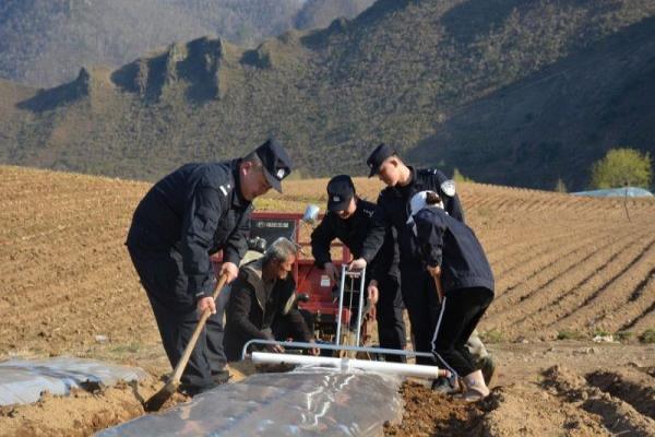 一抹抹藏青蓝在田间地头流动,该所民警发扬艰苦奋斗的作风,不怕脏、不怕累,撸起袖子、弯下身子,与群众一起扛起农具互相配合,划拉标线、覆膜打孔、施肥、盖土,分组包片、分工有序、各司其职。尽管烈日当空、汗流浃背、满身泥土,都没有影响到党员民警的热情,田地里呈现出一片繁忙的劳动景象。