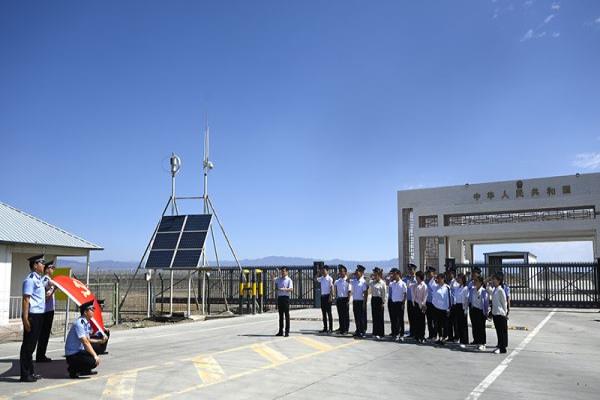 “我志愿加入中国共产党,拥护党的纲领……随时准备为党和人民牺牲一切,永不叛党。”在百里无人区的老爷庙口岸,在巍峨国门之下,全体党员共同高举右拳,庄严宣誓。