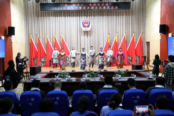 随后,共建双方带来精彩的文艺演出,舞蹈、歌曲、朗诵和乐器演奏等节目轮番登场,现场欢声笑语不断,欢快的朗玛堆谐、天杵乐队主唱索朗旦增和自治区歌舞团著名歌唱家次仁央宗动人的歌喉、国家级非遗传承人次旦带来的鹰笛独奏,把文艺演出的氛围推向了高潮,赢得了观众的热烈掌声。“再唱山歌给党听,我把歌儿献给你……”在《再唱山歌给党听》的旋律中,共建双方单位干部群众和演职人员围坐在一起,吃粽子、话家常,场面温馨而欢快,拉进了警民关系,共建文艺活动在歌声中落下帷幕。