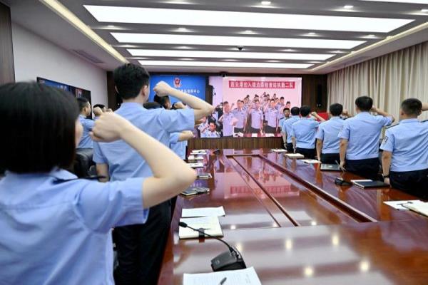 “我志愿加入中国共产党,拥护党的纲领,遵守党的章程,履行党员义务……”随后,在双方党支部书记的带领下,全体党员民警面向鲜红的党旗,庄严地举起右拳,用铿锵有力、掷地有声的誓言重温了入党誓词,表达了坚定不移听党话、跟党走,接续奋斗、拼搏奋进的决心和信念。宣誓结束后,双方党支部书记为8名过“政治生日”的党员民警赠送了“政治生日”贺卡,送上生日寄语,将仪式感拉满。“在政治生日这天,我收到了这样一张精美的贺卡,让我感受到了党组织的关心、期望和激励,我也将以此次政治生日为起点,更加全身心地投入到工作生活中去,忠于党,忠于党的事业,努力工作、奋力前行。”青年党员民警唐海琦感慨道。