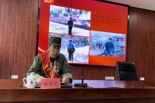 刘华先同志重点以对越自卫防御作战期间经历的“老山轮战”为背景,通过一个个动人心魂的战斗故事、一张张珍贵的照片,讲述了那段战火纷飞、英雄辈出的峥嵘岁月,引起了在场党员民警的共鸣。