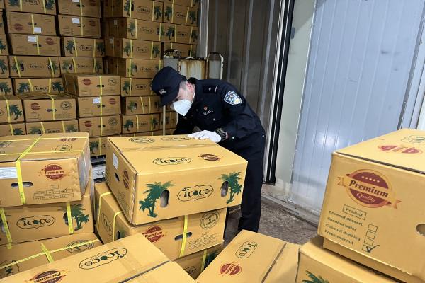 边检民警抽查卸运进口水果