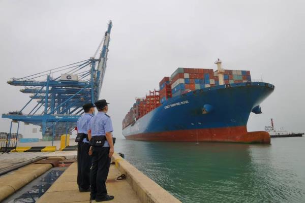 边检民警现场监护装载新能源产品集装箱班轮离泊