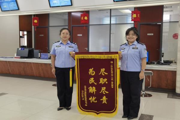 8月27日,白山市民李先生将一面印有“尽职尽责、为民解忧”的锦旗送到浑江边境管理大队驻白山市政务大厅办证民警秦乐、刘桐手中,对民警的帮助表示感谢。