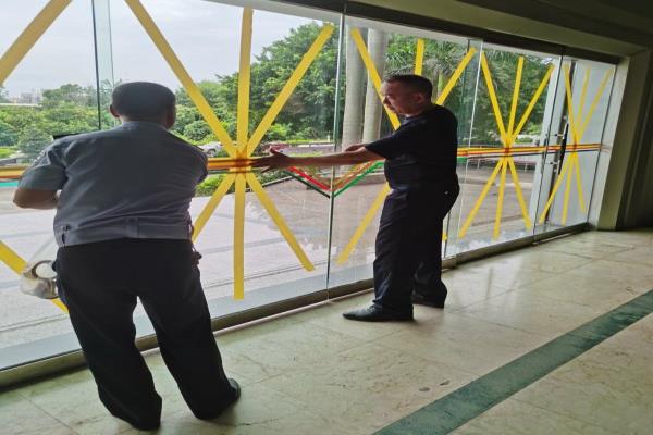 各单位领导带班在岗值守,落实防台防汛举措,有力保障指挥顺畅、处置得当,有针对性地落实各项防范措施:对排水系统进行疏通,对高大树木、门窗玻璃、天台设备等进行加固,预防高空坠物等安全事故;及时储备防汛物资、应急食品、药品等应急物资储备,全力做好防台物资保障工作;组织人员巡检,并对建筑门窗、天台设备、高大树木等用沙包、木板、绳子等工具进行加固;组织全面核查车况,做好车辆安全停放等。