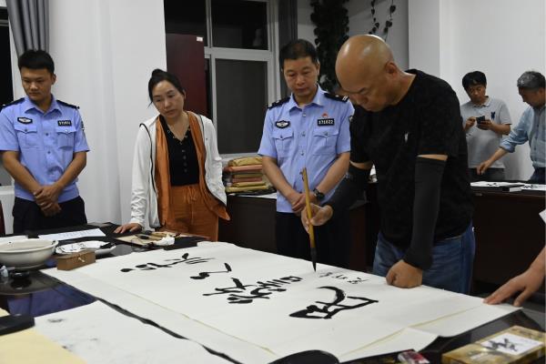 书画名家们时而洋洋洒洒,时而精耕细作,即兴创作着不同风格的书法、绘画作品。一张张白纸在书画名家们遒劲有力的笔下瞬间翰墨飘香。大家纷纷在佳作前驻足欣赏,细细品味,与书法家们互动交流,虚心求教,现场萦绕着浓浓的墨香和文化气息。参加活动的民警在繁忙的工作之余放松了身心,提升了素养,凝聚了警心,鼓舞了斗志。