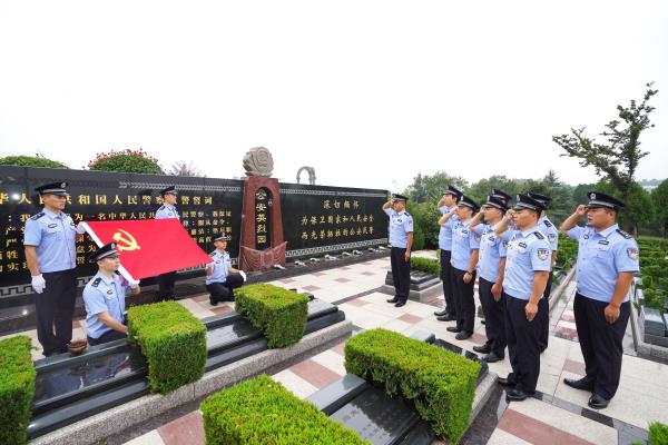 在公安英烈纪念园,全体民警整齐列队、庄严肃穆在烈士墓前脱帽默哀,在深沉的《献花曲》音乐中,民警手持鲜花聆听烈士们的事迹,瞻仰烈士墓碑并敬献鲜花,表达对革命先烈们的崇高敬意和怀念之情。随后,全体党员民警面向党旗集体重温了入党誓词,铿锵有力的誓词声在纪念园久久回响。