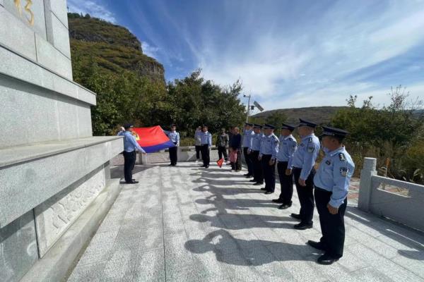 民警们来到辖区烈士纪念碑前,仔细打扫了一砖一瓦,随后全体民警脱帽肃立,向烈士默哀并敬献花篮,寄托无限哀思。紧接着,站领导用生动的语言向民警们讲述了革命先烈们的英雄事迹。最后,在领誓人的带领下,全体民警面向党旗和警旗,在烈士纪念碑前重温入党、入警誓词并庄严宣誓。铿锵有力的誓词在山林中久久回响,白色的花朵在纪念碑前随风飘荡。
