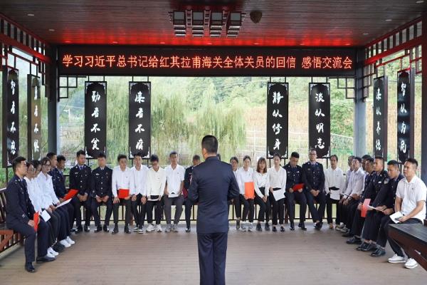 “当好让党放心、让人民满意的国门卫士,为强国建设、民族复兴积极贡献力量。”在大黑山分站文化长廊中,分站党委书记罗坚同志正在领学习近平总书记给红其拉甫海关全体关员的回信。