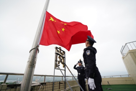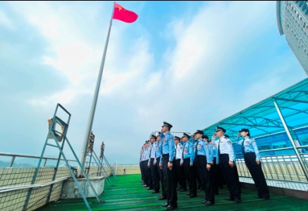 7时30分,升旗仪式正式开始,一声雄浑嘹亮“向国旗——敬礼!”的口令划破寂静,全体民警整齐划一,庄严敬礼,凝神注视着国旗的方向。伴随着雄壮的《义勇军进行曲》奏响,擎旗手奋力振臂,划出优美弧线,鲜艳的五星红旗映衬着星月交辉,迎风升起。四周平地上的长臂吊机,呈现出建设“湾区基石、国之重器”的新皇岗口岸和河套深港科技创新合作区的磅礴生机。先进典型代表胸前沉甸甸的功勋章,仿佛一个个金灿灿的小太阳,映衬着皇岗出入境边防检查站民警忠诚使命、奋勇拼搏的不变初心。