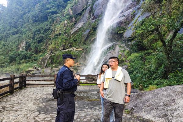 “警察同志,我们几个是从外地过来的,可以帮我们拍张合影吗?”“好啊,没问题。”说着,正在哈滂瀑布巡逻的民警战永超接过游客的手机,“咔嚓”一声合影定格,美好的时光留在了手机。