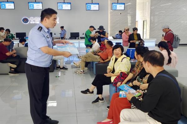 “小伙子,你发的这个宣传册不错呀,既能排解我们在这儿等待的无聊,又能学习这个关于边境的一些法律法规,还真是观景学法两不误呀,谢谢啊!”来自陕西准备跨境旅游的赵阿姨对宣传民警开心地说道。