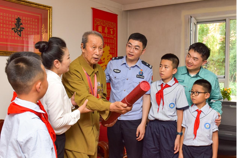 8月1日上午,在八一建军节来临之际,吉林通化边境管理支队、国网通化供电公司民警职工及4名少先队员,带着慰问品走进百岁抗美援朝老兵李尚春家中,为老人带来节日的祝福与陪伴。