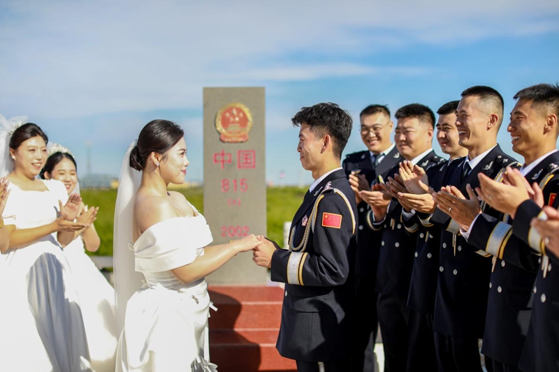 上午10时58分,当婚礼进行曲在边境线上响起,9对新人携手走过红毯,步入人生新的旅程。他们中有携手并肩守国门的检关夫妻,也有“你守国门我守家”的异地伉俪。“我愿与你结为夫妻,如同守护国门般忠诚,如同界碑矗立般坚定……”新人们在国门下许下爱的承诺,忠贞不渝的誓言回荡在辽阔北疆。9对新人手持朱笔,共同为象征国家主权的界碑描红,一笔一画将“中国”字样描得鲜亮如新,个人的婚姻承诺与国土的庄严在此刻完美交融,这场简约而庄重的婚礼仪式上,家国情怀成为最厚重的聘礼,忠诚坚守化作最长情的告白。
