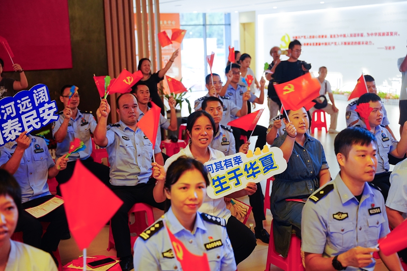 整场活动以纪念抗战胜利 80 周年、中共广西组织成立 100 周年、迎国庆为核心,通过微党课、情景讲述、视频展示、致敬先烈、艺术呈现等多元形式,串联红色历史与新时代故事,分为学思践悟、烽火记忆、红旗漫卷三个篇章,以艺术为媒介,以历史为脉络,以情感为纽带,引导观众在视听体验中感悟初心使命,坚定理想信念。“1925年,中共梧州支部成立,这是广西首个中共地方组织!” 活动开篇,地方党史专家的一堂好课《梧州在广西党史上的 “十八个第一”》,用史料梳理梧州作为广西红色策源地的贡献。接着由民警自编自导自演和地方艺术名家、少先队员共同合作出演的《烽火中的家书》《山河已无恙》《绣红旗》等轮番上演,通过历史与现实相结合,带领党员们穿越烽火连天的岁月,感受中华儿女家国天下的赤子情怀。情景讲述《守,望》感悟“老一辈守家国、新一代守国门” 的使命接续,则将 “传承” 二字诠释得淋漓尽致。三代人的 “守望” 跨越时空,“老兵们‘守’的是民族尊严,我们‘守’的是万家平安,这是同一种精神的延续。” 贵港边检站民警郑章皓说。