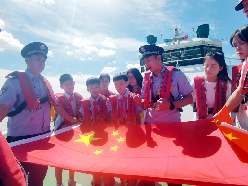 9月26日,浙江宁波出入境边防检查站携手驻地学校师生和社区干部群众共同开展“海上升国旗,踏浪守国门”主题巡航活动,喜迎新中国成立76周年华诞。