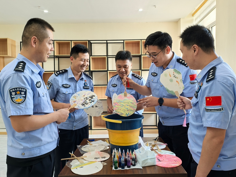 四楼图书室里,非遗漆扇创作吸引了众多目光。民警职工们围坐在一起,从琳琅满目的彩漆中精心选取心仪的颜色,运用入水、晃动漆染等独特手法,充分发挥创意,制作属于自己的专属漆扇。色彩在扇面上肆意流淌、变幻,一把把独一无二的漆扇便诞生了。大家在实践中,真切地感受到了非遗文化的博大精深,也让传统工艺的魅力在边检站内得以传承。