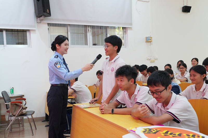 为了让同学们更真切地感受国门卫士的坚守,移民管理警察还分享了广西边检战友在一线缉毒、打击偷渡、查验证件的故事,让同学们纷纷感慨:“国防不是遥远的‘大概念’,而是每个人都能感受到的‘安全感’。”课堂中段,民警还融入了实用的知识科普与法治宣传:通过视频展示护照样式,解读其中蕴含的“中国浪漫”;列举护照、港澳通行证等出入境证件,明确合法出入国门的途径;结合“国门说法”提醒同学们警惕假证与偷渡风险,并穿插反诈宣传,剖析 “出国赚高薪” 等骗局的套路,叮嘱大家“走正道、不贪心”。最后,民警还针对青少年群体,给出了“学国防知识、护国防设施、防安全风险、传国防意识”等清晰可落地的行动指南,让同学们明白:参与国防建设并非遥不可及,从身边小事做起,就是在为国家“安全墙”添砖加瓦。