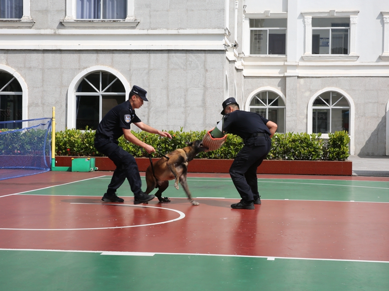 与此同时,另一侧的警犬实战技能展示环节,两只经过专业训练的警犬在训导员指挥下,精准完成服从指令、扑咬战术等科目,从基础的坐、卧、立、随行,到进阶的拒食、衔取送物,再到模拟“嫌疑人拒捕”的战术扑咬,每一个动作都利落规范、配合默契,充分展现出日常训练的扎实成效与“忠诚卫士”的专业素养。