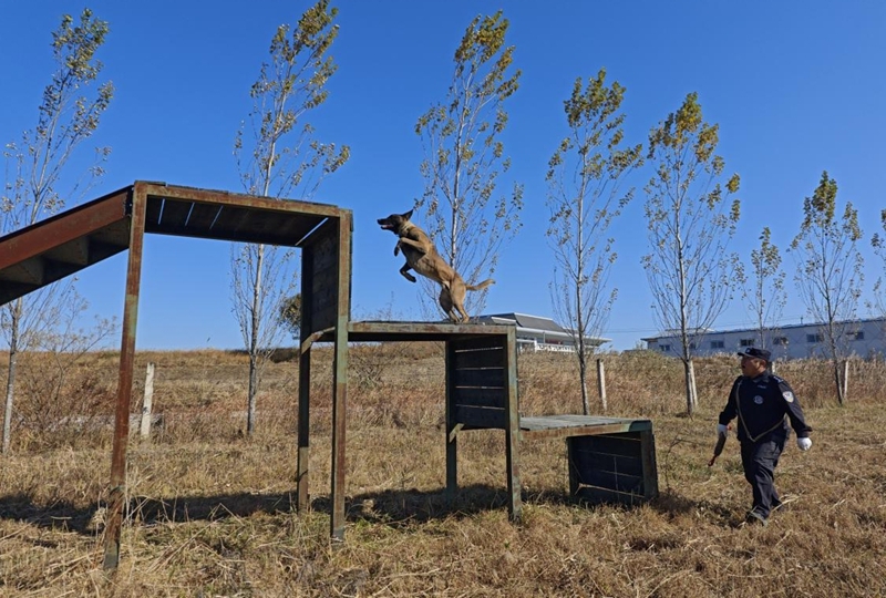 每天起床的号角还没吹响,阿杰就会拿着我的训练绳喊我:“黑龙,开工啦!”我立马竖起耳朵,尾巴兴奋地甩得像小马达,围着训练场地冲刺、跳跃,钻火圈时耳朵贴紧脑袋,跨障碍时四肢绷得像弹簧。最磨人的是“气味追踪”和“搜爆搜毒”训练,阿杰会把微量的违禁品样本藏在汽车底盘、货物夹层甚至轮胎纹路里,还故意混杂着汽油味、草料味干扰我。有一次他把一小包模拟毒品藏在货车的传动轴上,我围着货车转了两圈,凭着敏锐的嗅觉锁定目标,纵身跳上轮胎,前爪扒着车架,伸长脖子精准咬住藏货的布袋,阿杰笑着拍我的背:“好小子,连这么隐蔽的地方都能找到,没白练!”拉力训练时,它握着牵引绳跟我“拔河”,我压低身子,臀部后坐,四肢紧紧抓地,使出浑身力气往后拽,马犬的咬合力和耐力在这时发挥得淋漓尽致。赢了就扑到他身上舔他的脸,他总假装嫌弃地推开我,眼里却满是笑意。阿杰总说:“边境线容不得半点放松,只有练出铁打的身子,才能护好祖国的每一寸土地。”我懂他的意思,每次训练到舌头耷拉到胸口,舌头喘着粗气,只要他摸我一下说“好样的”,我就又能摇着尾巴冲上去。
