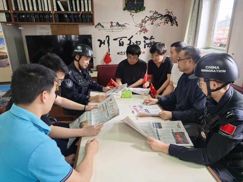 近日,宁波出入境边防检查站民警登上往返于中国台湾地区与大陆之间的国际航行船舶“海丰海口”轮,开展了一场生动的二十届四中全会精神宣讲活动,将党的创新理论送到长年奔波在海上的船员身边。