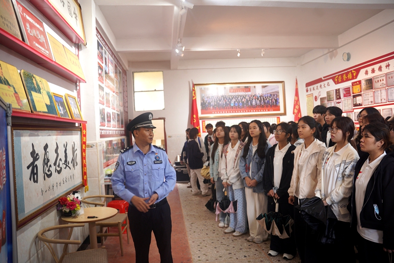 随后,师生们来到全国服务农民、服务基层文化建设先进集体峙浪边境爱民电影队。派出所政治教导员陈志金深情回顾了电影队与派出所共建的历程,讲述了如何以电影放映为纽带,深入村屯社区,宣传法律知识,传递惠民政策和温暖关怀,使电影队成为边境线上政策宣传和文化育人的重要阵地。