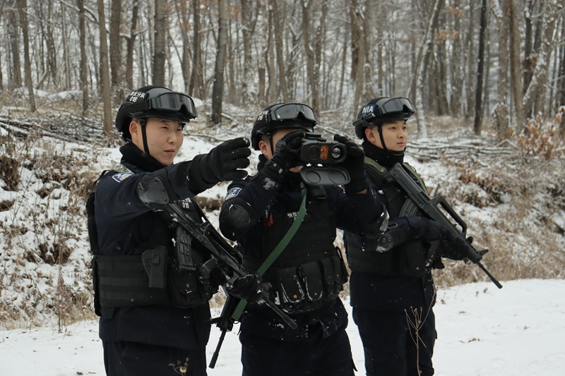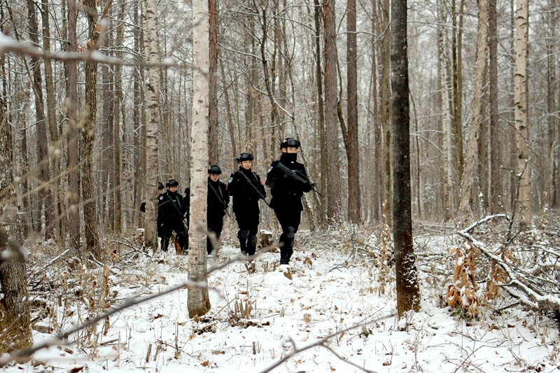 正午时分,队伍已走至瞭望塔下,大家在塔下暂停歇脚,拿出自热米饭短暂歇息充饥,自热米饭的热气终于从透气孔冒出来,白雾在每个人的护目镜上凝成水珠。民警范忠文通过对讲机呼叫:“快反一组已到达指定区域,一切正常。”短暂的休息后,大家互相拍了拍身上的积雪,继续向目标地区前行。